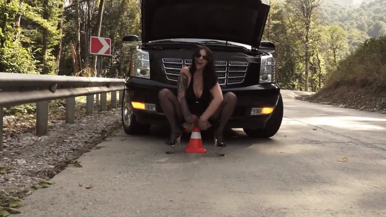 Пенелопа с гигантскими сиськами мастурбирует возле машины