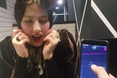 Красивую брюнетку доводят вибротрусиками до оргазма в ресторане